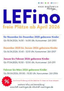 In unseren LEFino®-Kursen ab April gibt es noch einige freie Plätze. Dank einer Förderung sind die Gebühren für die folgenden